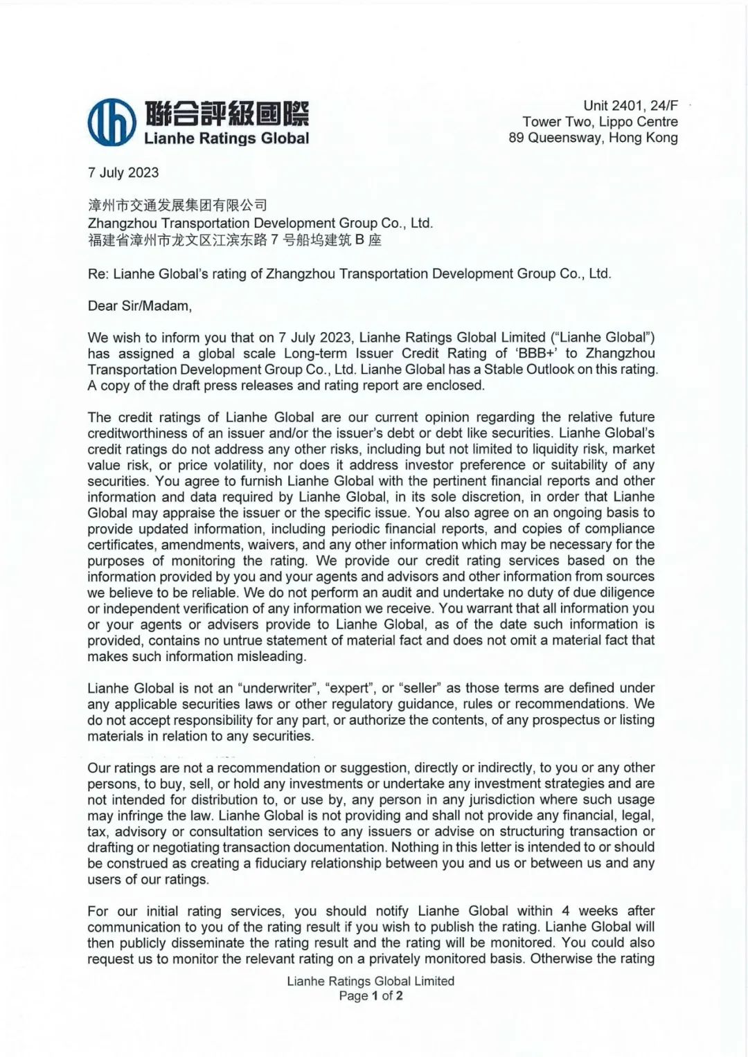 7月7日,經(jīng)國(guó)際權(quán)威評(píng)級(jí)機(jī)構(gòu)(聯(lián)合國(guó)際評(píng)級(jí))和國(guó)內(nèi)權(quán)威評(píng)級(jí)機(jī)構(gòu)(聯(lián)合資信評(píng)估股份有限公司)認(rèn)定,漳州市交通發(fā)展集團(tuán)有限公司本部及其權(quán)屬二級(jí)企業(yè)漳州市交發(fā)建設(shè)集團(tuán)有限公司分別獲得國(guó)際評(píng)級(jí)BBB+、國(guó)內(nèi)AA+主體信用評(píng)級(jí),展望穩(wěn)定,實(shí)現(xiàn)了漳州交通集團(tuán)歷史性突破。
