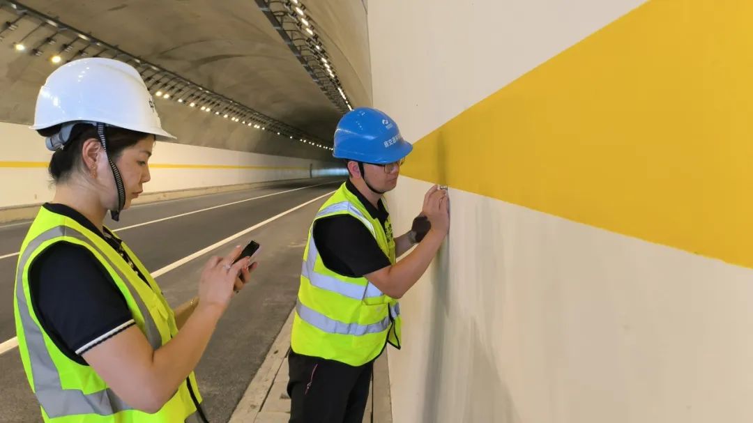 本次質(zhì)量抽檢嚴格執(zhí)行省交通運輸廳關于推進實施公路隧道洞壁亮化的有關標準要求,重點對粘結力、漫反射率、涂裝層厚度等三項指標進行實體抽檢。專業(yè)化的檢測人員和設備為此次質(zhì)量抽檢工作提供技術支持和指導,抽檢工作順利完成。