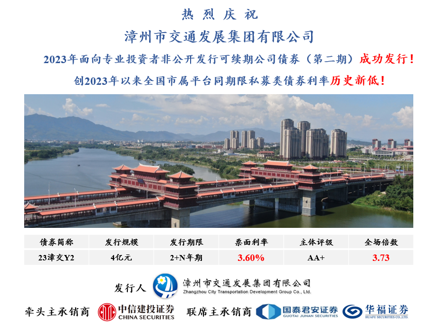 此次成功發(fā)行,離不開(kāi)牽頭主承銷商中信建投證券以及聯(lián)席主承銷商華福證券和國(guó)泰君安證券的全力支持和配合,是集團(tuán)與承銷商、投資者多方共同努力的結(jié)果,不僅為集團(tuán)發(fā)展提供了資金支持,也在債券市場(chǎng)上樹立了良好的形象。 未來(lái),漳州交通集團(tuán)也將繼續(xù)保持穩(wěn)健的發(fā)展態(tài)勢(shì),為投資者帶來(lái)更多的回報(bào)和信心。
