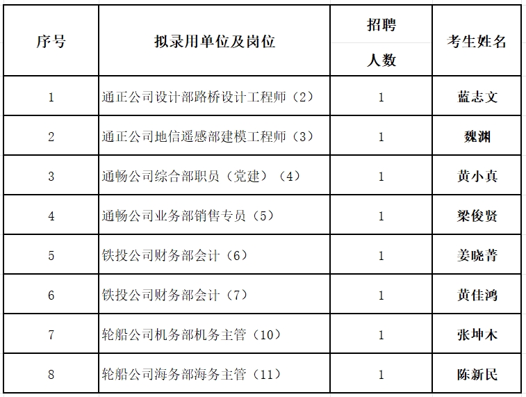 根據(jù)《漳州市交通發(fā)展集團有限公司2023年“人才漳州月”赴外公開招聘公告》的相關(guān)規(guī)定,經(jīng)資格審查、初面、復(fù)面、體檢、政審等程序,現(xiàn)將擬錄用8名人員予以公示,公示時間為2024年1月19日至2024年1月25日(五個工作日)。公示期間歡迎群眾來電、來信、來訪反映情況。