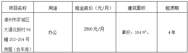 漳州市大通北新村94幢202-204號房屋承租人?,F(xiàn)將具體事項公告如下:一、租賃標(biāo)的物(標(biāo)的物以現(xiàn)狀為準(zhǔn)):