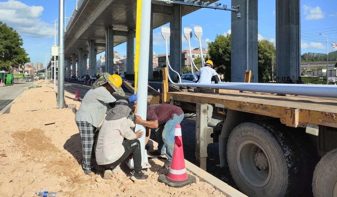 在國省干線公路聯(lián)十五線東山生態(tài)環(huán)島公路八尺門至光伏產(chǎn)業(yè)園段道路工程施工現(xiàn)場,一線建設(shè)者們身著被汗水浸透的工服,堅守崗位,忙施工、趕進(jìn)度,現(xiàn)場一派繁忙景象。
