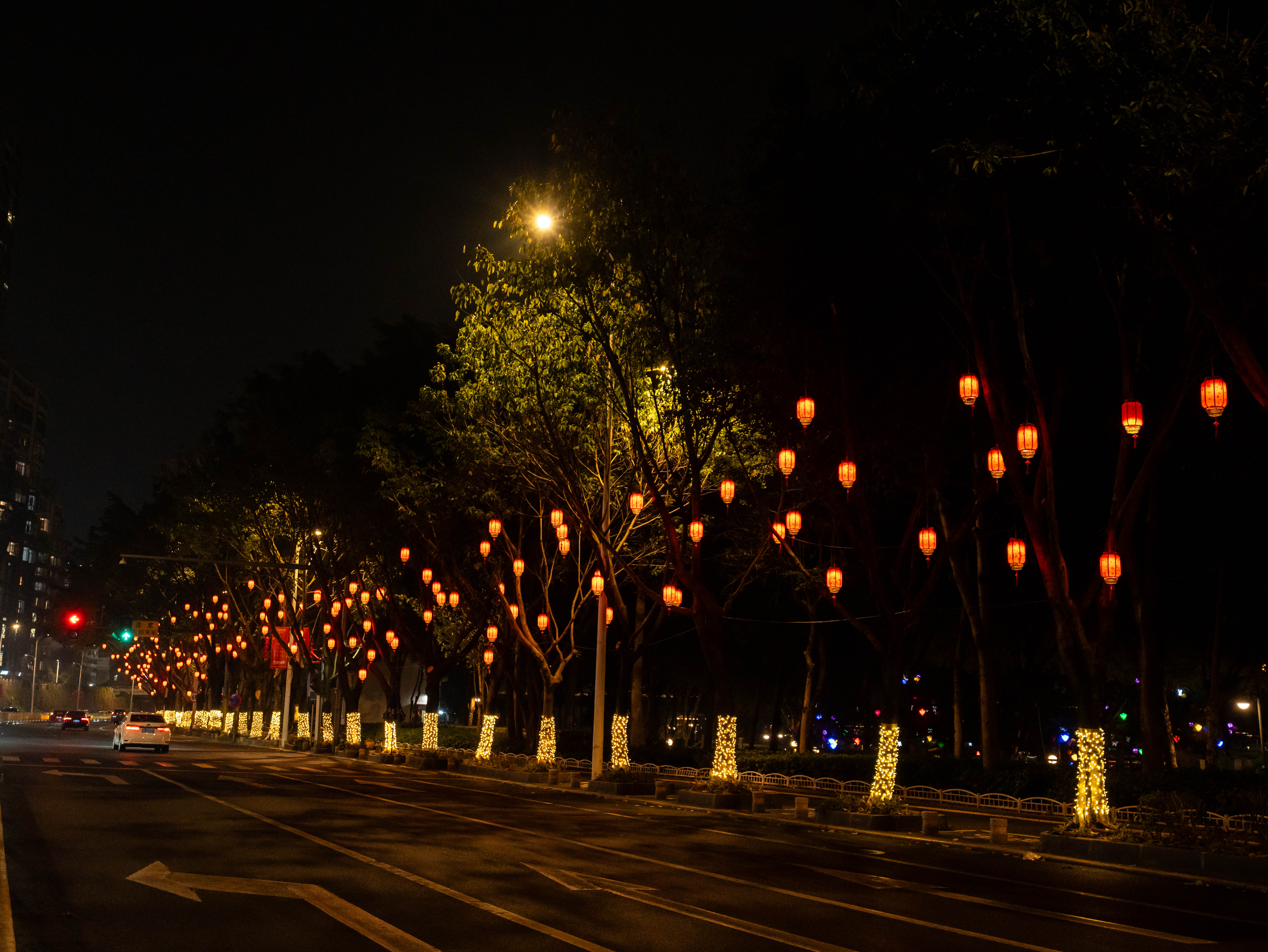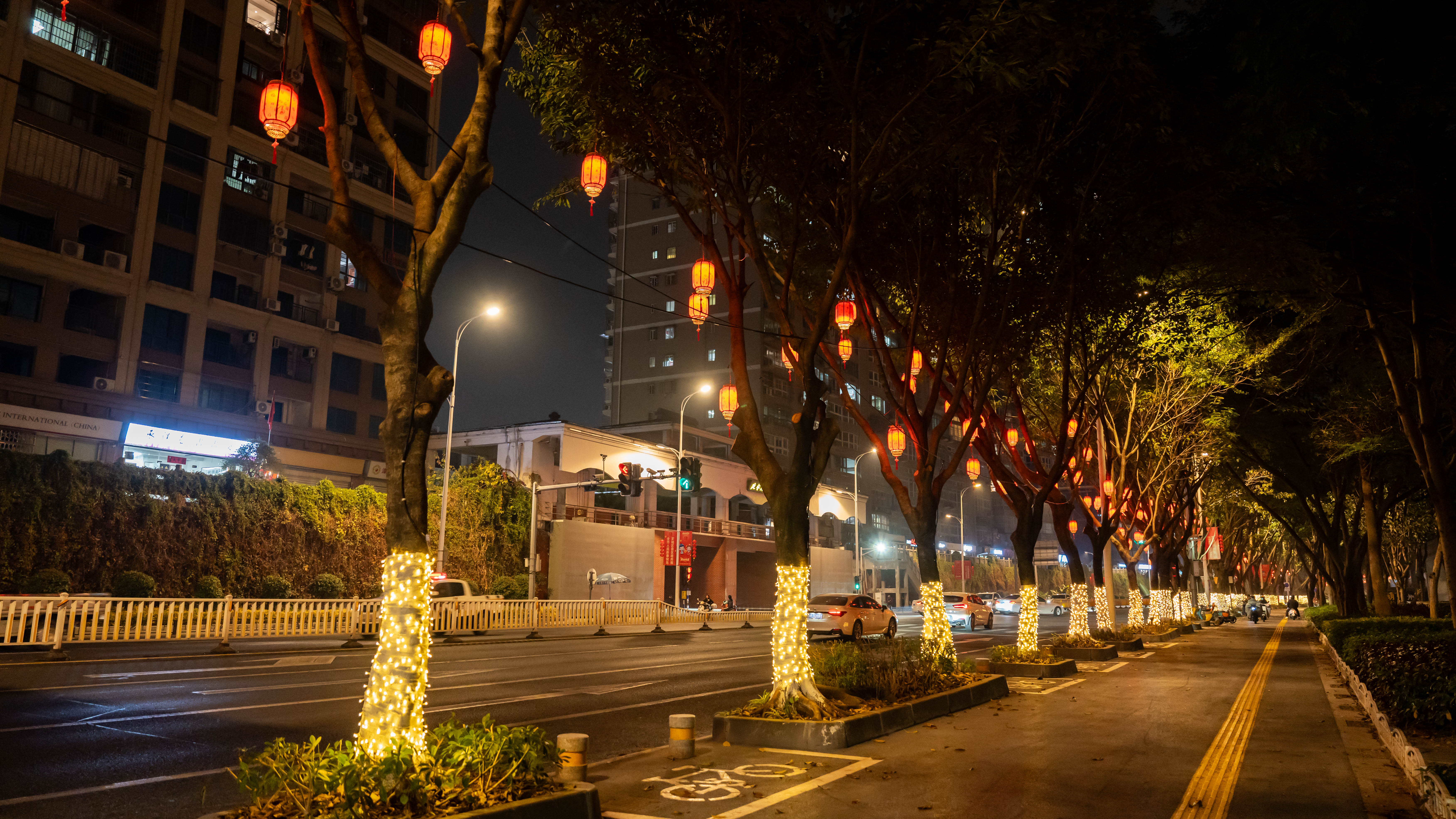 《鼓舞新春》(江濱路<戰(zhàn)備大橋-解放路閘門>)采用新中式燈籠結(jié)合滿天星樹燈,為江濱沿路的樹木披上光影華服,在技術(shù)賦能下構(gòu)筑了一條流動的文化光譜,實現(xiàn)“一盞燈籠連接萬家燈火”,不僅給這一條城市主干道增添了一抹靚麗的風(fēng)景,更表達(dá)了對全市人民的美好祝愿。