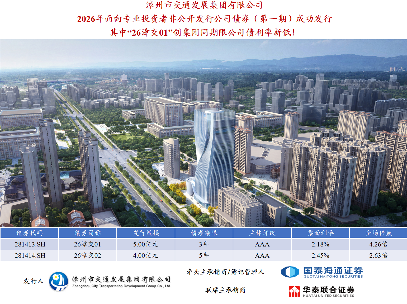 本期債券為雙品種債券,其中26漳交01發(fā)行期限3年期,發(fā)行規(guī)模5億元,票面利率2.18%,全場倍數(shù)4.26倍;26漳交02發(fā)行期限5年期,發(fā)行規(guī)模4億元,票面利率2.45%,全場倍數(shù)2.63倍。本期債券由牽頭主承銷商國泰海通證券和聯(lián)席主承銷商華泰聯(lián)合證券共同承銷,其中26漳交01創(chuàng)下集團同期限公司債利率新低!